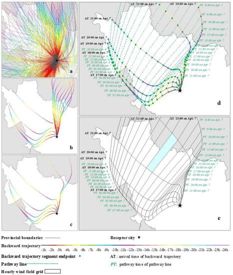 (3) Calculating pathway time and estimating the pathway line: According to the arrival time and backward hours of each trajectory, the time of each backward trajectory segment endpoint can be calculated, and it is defined as the pathway time. We connected the segment endpoints with the same pathway time to obtain a line (Figure 3d), which is defined as a pathway line indicating the geographic position of a moving air mass at the same moment as the pathway time.