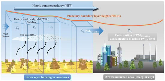 Based on the above analysis, we can see that urban PBLH mainly affects the hourly contribution of a specific PM2.5-inflow, and the average urban wind speed further determines its total contribution by affecting the residence time of PM2.5-inflow. In addition, it can be deduced that under the conditions of the average urban wind speed being >2 m/s and the interval time of each straw burning event being >4 h, when the urban PBLH is >600 m or the PM2.5-inflow concentration is <1000 μg m−3, the SOB sources will not lead the urban hourly PM2.5 concentration to exceed the standard. Previous studies have also shown that PM2.5 concentrations during a haze period in the city of Northeast China were mostly influenced by biomass burning emissions and the atmospheric diffusion conditions of the variation in PBLH and wind speed [].