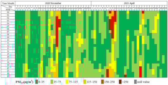 Calendar plot of hourly PM2.5 concentrations of Changchun during the SOB season of 2020–2021.