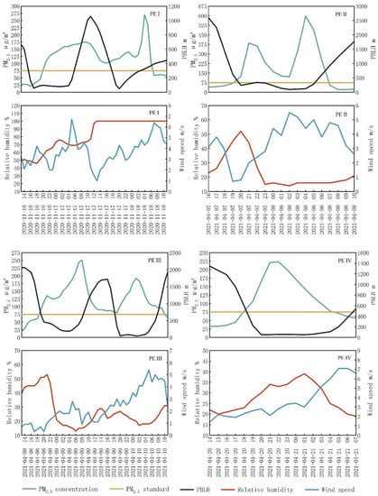 Hourly variations in PM2.5 concentrations, PBLH, wind speed, and relative humidity for Changchun during each PE (time format: yyyy-mm-dd hh).