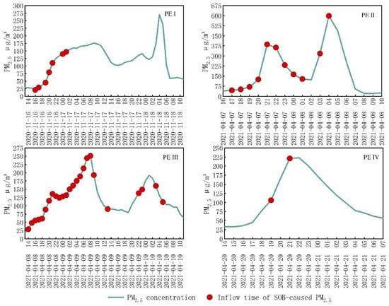 According to hourly variations in the PM2.5 concentrations of Changchun in November 2020 and April 2021 (Figure 5), there were 4 instances of PM2.5 PEs during the SOB season of 2020–2021, as shown in Table 1.