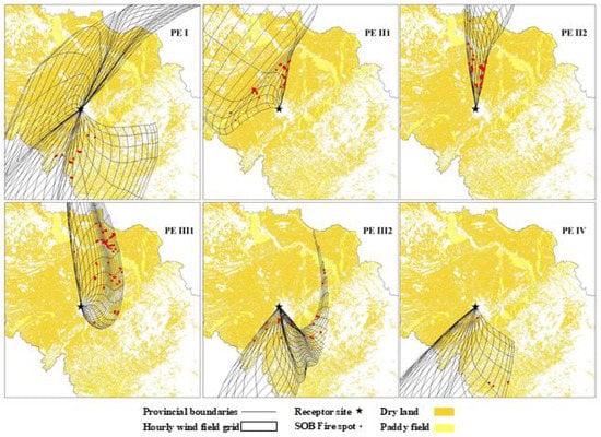 As SOB fire spots are not fixed and are continuous emission sources, the burning time, geographical location, and burning area are random and uncertain. If SOB occurs after the air mass has passed, its contribution to the corresponding urban hourly average concentration is limited, even if the burning site is distributed in HTP reconstructed by backward trajectories. Therefore, to identify the potential SOB sources during a specific urban PE among numerous fire spots of several days or more, first, spatial overlay analysis was performed on SOB fire spots and on the HWFGs of the specific PE. Then, the acquisition time of each fire spot within the HWFGs was compared with the pathway time of the grid where it was located. According to the actual situations of Jilin Province and the questionnaire results of local farmers [,], the average burning time of an SOB event is three hours during the post-harvest season; we assume that the fire could last three hours prior to its detection by Himawari sensors. Therefore, a fire spot whose acquisition time is within three hours before the pathway time of its located grid is screened and identified as a potential source of the specific PE. Taking PE II1 in Section 4 as an example once again, the procedure for identifying the potential SOB sources of PE II1 is shown in Figure S1.
