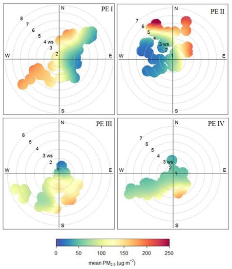Based on hourly backward trajectories with arrival times at hourly intervals, the HTPs and HWFGs during each PE were reconstructed. The spatial distribution of the SOB sources and their inflow time into the city, identified using HTPs and HWFGs, are presented in Figure 7 and Figure 8. From the spatial distribution of the identified SOB sources and their HTPs, we can judge the inflow direction of SOB-caused PM2.5. In addition, based on the urban ground-monitoring data of hourly PM2.5 concentration, wind speed, and wind direction, bivariate polar plots of PM2.5 were plotted to indicate the direction of potential sources [,], as shown in Figure 9.