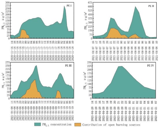 It is interesting that the contribution from SOB during PE IV was low, despite the burning area of the identified SOB fire spots being nearly twice that of PE I. The total contribution from SOB sources during PE IV was 4.9 μg m−3, which accounted for 0.31% of the urban cumulative PM2.5 concentration. This is because of the higher PBLH on the transport pathways of SOB sources and the long transport distance so that the particulate matter produced by straw burning was fully diffused and diluted before flowing to urban areas.