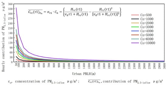 According to Equation (11), since the PM2.5 dry deposition rate and calculation time are constant values (vd = 0.0005 m/s, τ1 =3600 s), the hourly contribution of a certain PM2.5-inflow during the first hour of its residence time is determined by the PM2.5-inflow concentration and urban PBLH. Therefore, we investigated the relationship between the hourly contribution of PM2.5-inflow during the first hour and the urban PBLH levels (Hrc(τ1)) at different specific PM2.5-inflow concentrations (Cn). As the results show in Figure 11, when urban PBLH is >600 m, even if the PM2.5-inflow concentration is at an extremely high level of 10,000 μg m−3, its hourly contribution is still less than 30 μg m−3. This owes to the strong dilution and diffusion of PM2.5 in the vertical direction. Moreover, when the PM2.5-inflow concentration is <1000 μg m−3, the hourly contribution of PM2.5-inflow generally does not exceed 30 μg m−3, even if the urban PBLH is at a lower height of <600 m. Nevertheless, according to Equations (14) and (15), if continuous PM2.5-inflow within a few hours enters the city sequentially, its cumulative contributions are likely to induce the urban hourly PM2.5 to exceed the standard. According to the calculation of residence time, as in Equation (10), for the average diameter of the urban geographic space of Changchun, the residence time of a specific PM2.5-inflow will not exceed 4 h when the average wind speed is >2 m/s.