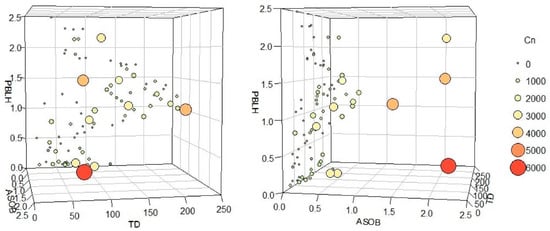 It can be seen from Equation (6) that the PM2.5-inflow concentration is determined by the conditions of each HWFG on the transport pathway, including multiple factors, such as the SOB burning area in the HWFG, the HWFG area, the PBLH of the HWFGs, and others, and the quantitative relationship between them is iterative and nonlinear. To analyze the impact of the main factors on PM2.5-inflow concentration, taking each HWFG during each PE as a unit, we calculated the burning area of the SOB sources, their transport distance, the average PBLH along the transport pathway, and their resulting corresponding PM2.5-inflow concentrations. These main influence factors are shown in a 4D scatterplot in Figure 12. It should be noted that the area of HWFGs in the model parameters is replaced by the indicator of transport distance in the following analysis because transport distance is easier to measure and carry out in the formulation and implementation of SOB management policies.