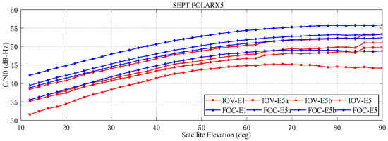 To further evaluate the C/N0 of the same signal with different satellite types, the C/N0 values of the two receiver types SEPT POLARX5 and TRIMBLE NETR9 are described in Figure 4 and Figure 5, respectively. For the two receiver types, the C/N0 values of the FOC E5 signal perform the best in all frequencies, while the IOV E1 signal is the worst. At the same cut-off elevation angle, the C/N0 value from the FOC satellites is 3~4 dB-Hz higher than that of the IOV satellites at all four signals. This difference may be due to the differences in transmit antenna mode and transmit power level between FOC and IOV satellites.
