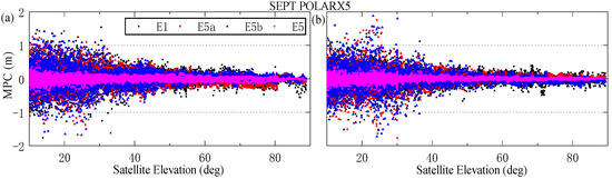 All geometric contributions (clocks, orbits and antenna movements, etc.), tropospheric delay, and first-order ionosphere delay are all eliminated in the MPC. Then the remaining terms in MPC include phase ambiguity, hardware bias, multipath, and observation noise. In general, the hardware delay remains stable for a certain period of time, and the phase ambiguity maintains a constant in a continuous arc period without cycle slips. Therefore, the constant term B can be derived by averaging the MPC values in a continuous arc. After subtracting term B from MPC, the MPC only contains the observation noise and multipath. Since the phase multipath is far less than the pseudo-range multipath, the pseudo-range multipath characteristics can be analyzed by MPC. For the MPCs of E5a, E5b, and E5, the E1 is selected as the input of carrier phase observation, and the MPC for E1 adopts the E5 as the additional carrier phase observation. Figure 6 and Figure 7 depict the MPC values against satellite elevation of different Galileo satellites (IOV-E12, FOC-E04) for different receiver types. It can be seen from the figure that the fluctuation range of MPC is within 2 m for different types of satellites. E5 frequency is significantly smaller than other signals in terms of MPC value. The MPC value is large at low cut-off elevation angles, which is mainly due to its greater noise. To further investigate the MPC characteristics of each satellite system, the RMSs of the MPC for each type of satellite are shown in Figure 8. It can be seen that the RMS of MPC for the Galileo signals is all within 0.3 m, which can be ordered as E1 E5b > E5a > E5. it is generally acknowledged that the larger signal bandwidth produces better suppression performance of multipath. The bandwidth of E5 is larger than that of other signals, with a value of 51.15 MHz.