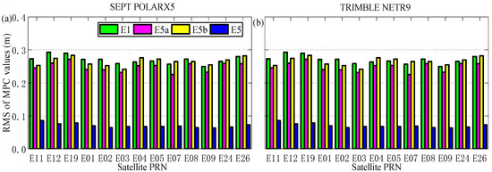 RMS of MPC for different satellites from the different receiver types (a): SEPT POLARX5, (b): TRIMBLE NETR9.