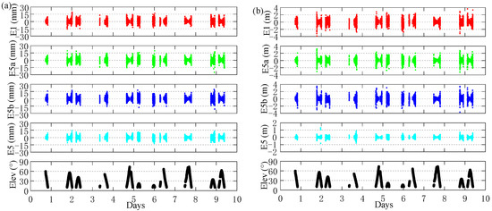 Using Equation (14), the phase and pseudo-range observation residuals in each epoch are estimated by least squares. The single-difference residual of Galileo each frequency was performed on the observation data of the ultra-short baseline CUT0-CUTA. The lengths of the baseline are 8 m. Observation data are taken from ten consecutive days, which are days of the year (DOY 350–359, 2018). The receiver type is TRIMBLE NETR9, and located at Curtin University, Perth, Australia. The observation data were collected, which was 30 s sampling interval.