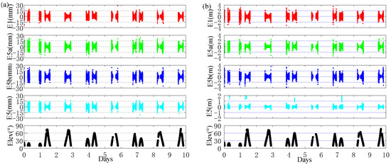 Figure 9 and Figure 10 show the time series of pseudo-range and carrier phase single-difference residuals for Galileo FOC (E03) and IOV (E19) satellites, respectively. From the figures, the single-difference carrier phase and single-difference pseudo-range residuals of Galileo are within 15 mm and 2 m, respectively. Under the influence of pseudo-range multipath and noise, the lower the cut-off elevation, the larger the single-difference residual. Based on the single-difference residuals, the statistical results of the raw pseudo-range and carrier phase accuracy are shown in Table 3. From Table 3, Galileo quad-frequency pseudo-range observations have an accuracy of about 20~50 cm. The carrier phase observations have an accuracy of about 1~3 mm, and the accuracy of the observations at E5 is significantly better than E1, E5a, and E5b frequency. The accuracy of FOC observations is basically equivalent to IOV observations.