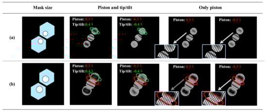 Besides the position of the mask, the size of the mask also restricts the accuracy of the co-phasing error sensing. By controlling the size of the mask and cooperating with our further processing of OTF in the frequency domain, it can effectively distinguish between piston error and tip/tilt errors. Since the graphical representation of six sub-mirrors is too complicated to label, to make it easier for readers to understand, we use two sub-mirrors to clearly illustrate how feature images we proposed effectively distinguishes piston error and tilt/tilt errors, as shown in