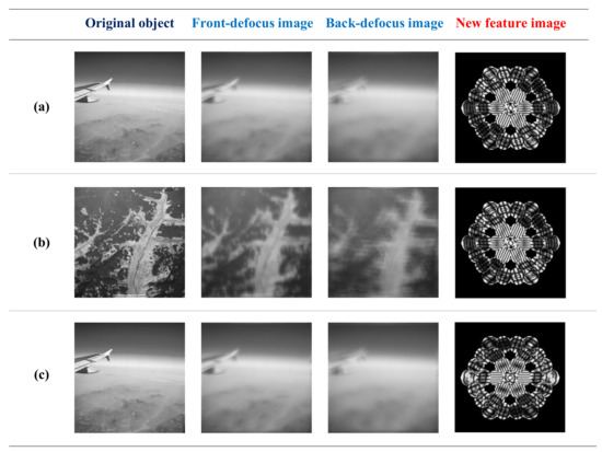 Figure 8a,b, where it can be seen obviously that the new feature image is completely independent of the object. In the presence of different phase aberrations, the schematic diagrams of the extracted feature are different, as shown in