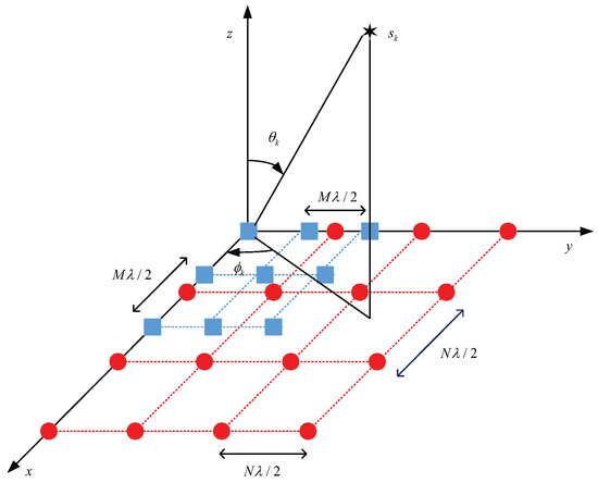 A CPPA consists of two planar sub-arrays with and physical sensors, respectively, where M and N are coprime integers. As shown in Figure 1, the CPPA contains a total of physical sensors, and the sensor position sets of the first and second planar sub-array are and , respectively. Therefore, the sensor position set of the CPPA is and can be expressed as