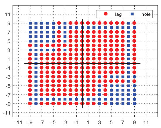 Since the optimization problems (22) and (23) are convex, we can solve them directly by employing the interior point method [28]. Then, we can obtain the estimated optimal covariance matrices and corresponding to and . Subsequently, we extract the elements and , filling the holes at positions and in matrix . Similarly, we use and to fill the holes of matrix at positions and . After the above interpolation operation, we can initialize the matrix to obtain a matrix that does not contain the missing elements of the entire rows and columns. In addition, we demonstrate the structure of the virtual signal position set corresponding to , as shown in Figure 3.