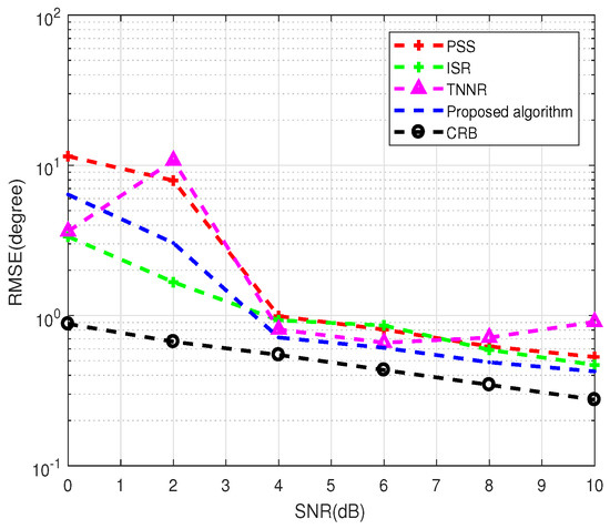 In the second experiment, we evaluate the estimation performance of all tested algorithms for uncorrelated targets. Figure 6 shows the RMSE of the angle estimate versus SNR, where two uncorrelated targets are located at and , the number of snapshots is 10, and the SNR varies from 0 dB to 10 dB. As shown in Figure 6, when the SNR is greater than or equal to 4 dB, the proposed algorithm has the best estimation performance compared to the other test algorithms. The reason is that the proposed algorithm utilizes virtual aperture extension and sparse matrix recovery. However, when the SNR is lower than 4 dB, the performance of the ISR algorithm is better than that of the proposed algorithm because the matrix completion accuracy of the proposed algorithm decreases, leading to decrease in the estimation accuracy of the proposed algorithm. The performance of the TNNR algorithm degrades when the SNR is high. The cause is that the TNNR algorithm cannot complete the missing elements of the entire rows and columns in , which significantly affects the sparse matrix recovery accuracy and reduces the DOA estimation performance. The PSS algorithm has the worst estimation performance due to not utilizing virtual aperture expansion. Furthermore, as the SNR increases, the estimated performance of all tested algorithms becomes relatively flat, which is limited by the pre-defined sampling grid.