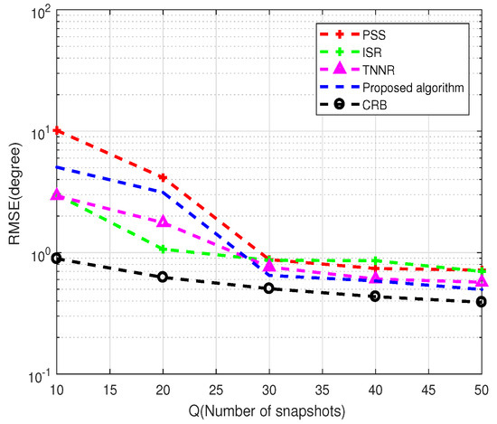 In the third experiment, we compare the estimated performance of all tested algorithms versus the number of snapshots, where we assume two uncorrelated targets located at and , the SNR is 0 dB, and the number of snapshots varies from 10 to 50. As demonstrated in Figure 7, when the number of snapshots exceeds 20, the proposed algorithm can obtain the optimal estimation performance due to the virtual aperture expansion and sparse matrix recovery. When the number of snapshots is less than or equal to 20, the ISR algorithm is better than the other test algorithms because it uses an iterative sparse recovery algorithm to improve the angle estimation performance. Under the condition of a low SNR and low snapshots, the TNNR algorithm outperforms the proposed algorithm. The explanation is that the TNNR algorithm has better completion accuracy than the proposed algorithm for empty elements that are not entire rows and columns. Therefore, the proposed algorithm has better estimation performance than the other test algorithms under mild conditions.