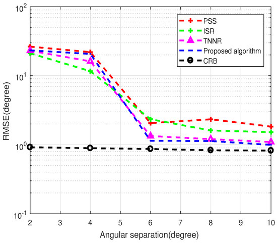 In the fourth experiment, we evaluate the estimation performance of all tested algorithms for closely spaced targets. We assume two closely spaced targets are located at and , where varies from to . Figure 8 shows the RMSE versus the angular separation, where the number of snapshots is 30, and the SNR is fixed at 0 dB. As shown in Figure 8, all the test algorithms fail when the angular separation is less than or equal to . The rationale is that the two closely spaced targets will cause the rank loss of the cross-correlation matrix between the sub-arrays, thereby reducing the angle estimation performance. When the angular separation is more significant than , the proposed algorithm shows optimal estimation performance compared to the ISR, TNNR, and PSS algorithms. The reason is that the proposed algorithm obtains the largest virtual aperture by the enhanced matrix completion technique, thereby improving the estimation performance. However, the ISR algorithm only utilizes part of the consecutive lags, so the performance of this algorithm is lower than that of the proposed algorithm. Since the TNNR algorithm cannot complete the empty elements of the entire rows and columns, its performance is lower than that of the proposed algorithm. However, it has more virtual apertures than the ISR and PSS algorithms, so the estimation performance is better than these two algorithms. Since the PSS algorithm exploits the co-prime property to remove ambiguity and does not exploit virtual aperture expansion, it has the worst estimation performance compared to the proposed algorithm and the ISR algorithm.