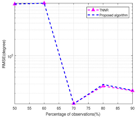 In the fifth experiment, we evaluate the RMSE of the proposed algorithm and the TNNR algorithm versus the percentage of observations. We set that the received data of a URA is , where the inter-element spacing is half a wavelength, and the SNR is set to 10 dB and . Suppose two targets are located at and , and the searching grid is set to 0.002 for and . We randomly select elements of as available observation elements. Figure 9 shows RMSE versus the percentage of observations. It can be seen from Figure 9 that, when there are no missing elements in the entire row or column, the TNNR algorithm is slightly better than the proposed algorithm because the TNNR algorithm knows accurately the number of targets. However, the number of targets in practical problems is usually unknown, so the proposed algorithm has more practical application value.