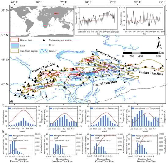 Map showing the TS study region (a); changes in annual temperature and precipitation (b,c); map of study area showing the spatial distribution of lakes, glaciers, rivers and meteorological stations (d); monthly average temperature (ERA-5) and precipitation (GPCC) (e); hypsometric curve of the TS region and distribution of the area by layer under each 500 m elevation band (f). Note: Jan = January, Mar = March, Jul = July, Sep = September, Nov = November.