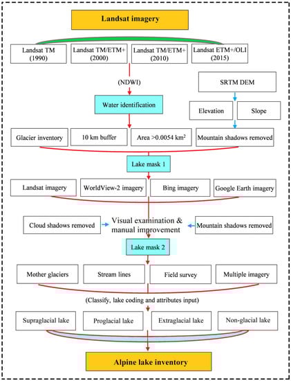 Widely adopted methods for lake extraction include automatic water body information extraction and manual vectorization. Considering different perspectives from delineating glacial lakes [24,30,31], as well as their complicated climatic and topographic conditions, many studies used distances of 2, 3, 5 or 10 km from the glacier terminus or the nearest glacier boundaries [19,31,32,33]. Moreover, they used a distance of 10 km from the mother glacier termini as a reasonable guide and threshold suitable for the delineation of glacial lake boundaries in the Third Pole region [31]. Therefore, during this study, alpine lake surface areas within a 10 km buffer of the maximum glacier margin during the 1990–2015 period were extracted using an automatic water body information extraction method. The procedures for lake extraction are shown in Figure 2. This was accomplished mainly by applying the normalized water body index (NDWI: Normalized Difference Water Index) and visual inspection with manual improvement. The automated lake extraction process can be mathematically defined as: