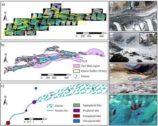 Diagram showing the classification of alpine lakes across the TS region (a); the available Landsat images used in the TS; (b) alpine lakes within a 10 km buffer zone of a glacier were extracted in the TS; (c) the position of different types of alpine lakes relative to the glaciers; (d–h) examples of supraglacial, proglacial, extraglacial and non-glacial lakes in the TS. Note: the bule framework means the different types of alpine lakes.