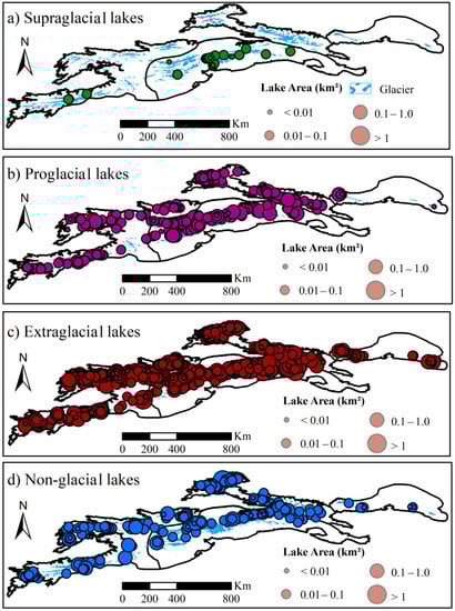 In this study, supraglacial lakes were usually small and occurred on the glacier surface where they were dammed by ice. They mainly appear at the termini of valley glaciers that are characterized by large-scale areas and lengths (Figure 3c,d). Proglacial lakes are directly controlled by the advance or retreat of glaciers. Thus, these glaciers (e.g., those found in cirques and hanging valleys) are of small to medium size and show evidence of rapid retreat in response to a warming climate (Figure 3c,e,f). In addition, extraglacial lakes are positioned in front of the glacier termini without a direct connection to the glacier termini. However, they are directly fed by glacier meltwater, particularly when associated with valley glaciers. Many extraglacial lakes occur several meters to kilometers in front of the glacier termini (Figure 3c,g). We defined non-glacial lakes as lakes that could not receive glacier meltwater, and no streams occurred between the non-glacial lakes and the upper upstream glacier (Figure 3c,h).