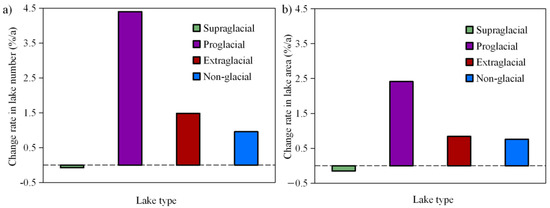 The change rates for the various alpine lake types are shown in Figure 5. Both the number and area of proglacial lakes from 1990 to 2015 exhibited the highest increase with rates of 4.40%/a and 2.41%/a, respectively. Increases in extraglacial lakes and non-glacial lakes followed. In the case of extraglacial lakes, their rates of increase in number and area were 1.48%/a and 0.84%/a between 1990 and 2015, respectively. The increase in extraglacial lakes was higher than those for non-glacial lakes, increasing at rates of 0.96%/a and 0.76%/a in 1990 and 2015. It is noteworthy that both the number and area of supraglacial lakes decreased at rates of −0.08%/a and −0.15%/a, respectively.