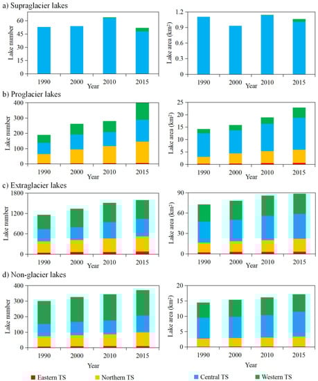 Nearly all the supraglacial lakes in the TS are distributed in the Central TS. No continuous positive trends in the number or area of these supraglacial lakes were found from 1990 to 2015 (Figure 6a). For proglacial and extraglacial lakes, both exhibited increases in area, especially the proglacial lakes in the Eastern, Northern and Western TS. They also exhibited higher expansion rates of 6.47%/a, 3.49%/a and 5.51%/a, respectively, which are obviously higher than the rates (2%/a, 1.29%/a and 0.53%/a) associated with extraglacial lakes (Figure 6b,c). In the Central TS, the expansion rate of proglacial lakes was about two times higher than that of the extraglacial lakes. All non-glacial lakes (Figure 6d) showed a relatively slow expansion rate in comparison to the other glacial lakes, with rates of 1.75%/a (Eastern TS), 1.03%/a (Northern TS), 0.73%/a (Central TS) and 0.62%/a (Western TS).