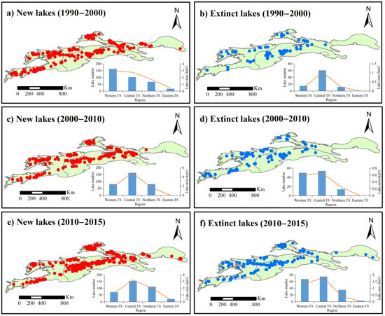 It is worth noting, however, that many alpine lakes have disappeared (Figure 7b,d,f). For example, from 1990 to 2000, a total of 102 alpine lakes (14 non-glacial lakes and 88 glacial lakes) disappeared in the TS. The total loss in area was about 1.66 km2. From 2000 to 2010, 124 alpine lakes (6 non-glacial lakes and 118 glacial lakes) disappeared, accounting for a total area loss of 1.54 km2. Then, from 2010 to 2015, 193 alpine lakes (14 non-glacial lakes and 179 glacial lakes) disappeared, and the lake area decreased by 3.97 km2.