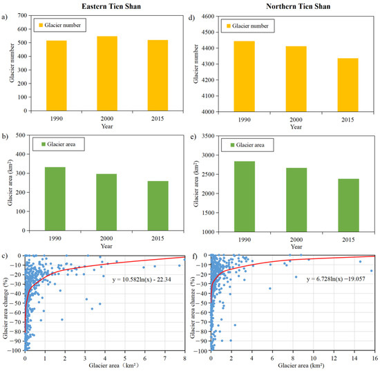 Changes in glacier number and area across the Eastern Tien Shan. (a,d) Glacier number; (b,e) glacier area; (c,f) change rates in glacier area for glaciers of different sizes.