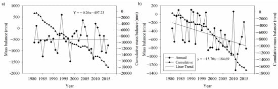 Mean annual and cumulative glacier mass balance for Tuyuksuyskiy glacier and Urumqi glacier No. 1 in the TS from 1980 to 2015. (a) Ts. Tuyuksuyskiy glacier; (b) Urumqi glacier No. 1.