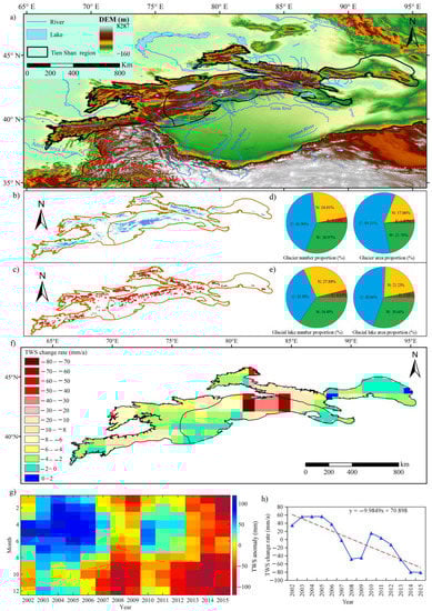 Geographical information in the TS region (a); spatial distribution of glaciers and glacial lakes (b,c); the proportion of glaciers and glacial lakes (d,e); spatial variations in annual TWS (f); variations in monthly TWS (g); variations in annual TWS (h).