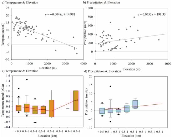 Monthly climate data between 1990 and 2015 from 34 national meteorological stations in and around the TS in China were obtained from the meteorological science data-sharing service network (http://data.cma.cn/ accessed on 5 June 2019). For meteorological stations outside China, data from 43 other meteorological stations in Central Asia were screened. Screening criteria included the period of monthly temperature and precipitation data collected between 1990 and 2015.