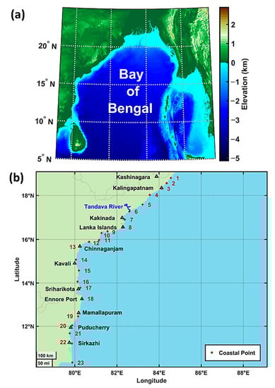 The analysis involved the proper identification of the spatial and temporal extent of the coastal upwelling processes along the Indian coast as the preliminary step [7,8,9,10,11,12]. Consequently, the coastline between 10.25°N and 19°N, as well as from 78°E to 90°E, with upwelling features was identified for carrying out the intended analysis. In addition to these coastal points, the entire Bay of Bengal (5–25°N, 78–100°E) was selected as the study area for the complex empirical orthogonal function (CEOF) analysis. Windstress data were sampled to a daily temporal resolution centered on the date of the SSHA dataset. For this, a mean of the high-temporal-resolution data (windstress) over the period of the low-resolution data (SSHA) was considered (after filtering high frequencies) whenever a direct comparison was necessary.