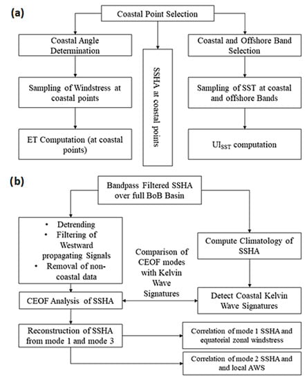 (a) Methodology of computation of upwelling indicators at the coastal points; (b) Analysis of spatial SSHA for detection of coastal Kelvin waves.