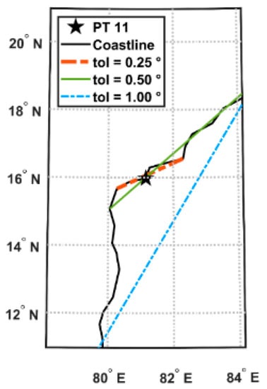 The traditional method of the estimation of coastal angles involves a visual estimation of the slope of the coastline, as demonstrated by [21] for the west coast of North America over a 200 mile (322 km) section based on bathymetric charts. Ref. [22] used a similar method in the Canary current upwelling system utilizing the gridded relief model ETOPO1 based on the mean slope of the 200 m isobaths line over a segment of the length of roughly 80 km. Ref. [23] used a straight line inclined at 24° to approximate the western coast of India from 10° to 20°N. Ref. [24] extended the same approximation down to the southern tip of India in their analyses involving the use of coastal angles. Similar simplified approximations for the coastline were also used by ref. [25] in their analysis of coastal upwelling along the KwaZulu Natal Bight in South Africa. To determine the orientation of the coastline in the present analysis, at each of the 23 coastal points, the coast was partitioned into two lines that converged at that given point. The two lines on either side of the given point were then simplified using the Douglas–Peucker line simplification algorithm (with varying tolerance parameter values) [26] and the point closest to the given location was connected to form a line segment parallel to the coast at that point. The orientation of the new line then determined the coastal angle. The coastal angle values for the different tolerance parameters are tabulated as Table 2. It may be noted that the tolerance value of 2.5° (in terms of the distance centered about a coastal point) resulted in the entire stretch of the coastline to be approximated as a single straight line, the simplest possible approximation. Three different approximations of the coastline around point 11 based on three different tolerance values are demonstrated in Figure 3. The ET corresponding to the lowest tolerance parameter value of 0.25° (5th column of Table 2) was used for the entire analysis. However, for comparative purposes, we also presented results for two tolerance values for coastline simplification, 0.25° and 1° (5th and 7th columns of Table 2), centered about the coastal points.
