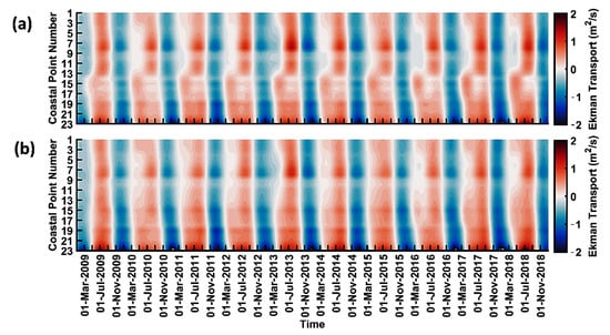 The temporal variation of the bandpass-filtered ET along the coast and offshore transport resulting from the AWS is presented in Figure 4 for two different values of the tolerance parameter used to compute the coastal angles. Figure 4a corresponds to a tolerance of 0.25°, while Figure 4b corresponds to a value of 1.0°. While a greater alongshore variation of ET was observed in the first case, both figures illustrate the ET to turn positive starting from March and persisting up to September along the major part of the Indian east coast. The strongest ET was observed between points 6 and 8 (17.276°N–16.558°N, i.e., around Kakinada, from the mouth of the Tandava river to the Lanka Island in the northern Godavari Delta in Andhra Pradesh), often extending further northward to point 1 (Palasa-Kasibugga). For a lower value of the tolerance parameter (Figure 4a), the ET along a southern stretch of the coast (point 13: Chinnaganjam (15.672°N) to 17 (13.782°N close to Sriharikota off Lake Pulicat) showed a more rapid increase in April, often reaching its maximum value by May (premonsoon) and declining through the SW monsoon months. The ET computed from the low tolerance parameter coastal angles agreed more closely with the temporal variability of the UISST (particularly around point 15, where the coastline has a convex curvature), as in Figure 5. The duration of peak UISST signatures (around point 15) observed in our analysis also agreed closely with the findings of [11], which introduced the methodology for the UISST computation utilized in our analysis. Hence, it was observed (by comparing Figure 4a,b) that an oversimplified coastline could lead to significant differences in the observed ET variability. We relied upon ET corresponding to the lowest tolerance parameter value of 0.25° for the analysis, as this also matched the grid spacing of the windstress data.