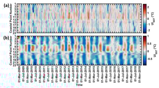 Temporal variation of (a) unfiltered and (b) filtered SST-based UI (UISST) along the eastern coastline of India.