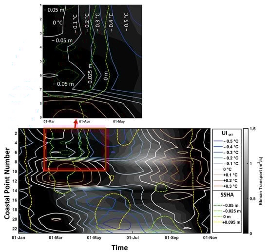 The wind and SST parameters were sampled at the coastal points to first compute the ET and UI. The windstresses were sampled at each of the 23 coastal points using a Cressman window with a radius of influence of 75 km [27], and the ET was obtained from it, following [24], as: