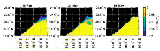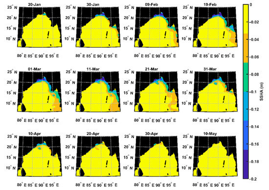 SSHA variations contain distinct signatures of propagating planetary-scale waves including the subsurface variations associated with them [50]. Following [13], we first located the activity of upwelling and downwelling coastally trapped Kelvin waves in the region using the long-term mean SSHA variability. Upwelling Kelvin waves are associated with negative coastal SSHA, while downwelling Kelvin waves are associated with positive coastal SSHA signatures. The 10-year mean (climatology) SSHA from 2009 to 2018 are presented in Figure 7 and Figure 8 for every 10th day starting from the initiation of the wave. It was observed that the coastal BoB experienced two sets of upwelling and downwelling Kelvin waves that propagated counterclockwise starting from the coast of Sumatra in the east up to the coast of India. The first upwelling (downwelling) Kelvin wave prevailed from January to April (end of April to late August), and the second upwelling (downwelling) Kelvin wave from the end of August to September (October to December). The pre-SW monsoon period (months of March, April, and May) and SW monsoon period (the months of June, July, August, and September) considered covered the period of activity of three of the Kelvin waves: the first upwelling and downwelling and the second upwelling Kelvin wave [13]. Since the second downwelling Kelvin wave was restricted to the southeastern BoB and terminated before reaching the head Bay, it was unlikely to affect the coastal upwelling along the western BoB.