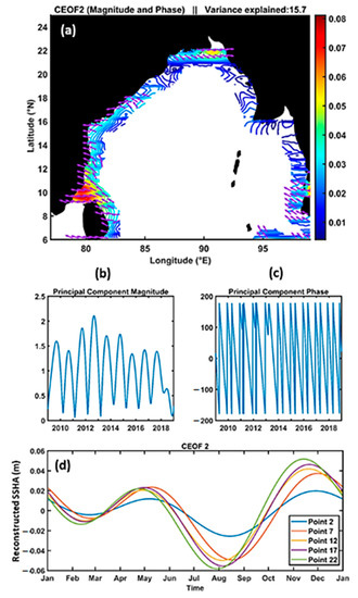 The first CEOF mode (Figure 9), which captured 75.9% of the variation in the coastal SSHA, consisted of a band of strong magnitudes spread along the coastal waveguide of the BoB with a progressive narrowing of the band observed counterclockwise along the waveguide. The phase of the first CEOF also exhibited a small clockwise rotation from the eastern to the western margin of the bay. The greatest magnitude (>0.035) of this CEOF was observed at the head bay with weaker values (around 0.03) along the eastern and northwestern margin. Along the east coast of India, these signals extend down to Kakinada (point 7). The magnitude and phase of the corresponding time series illustrated a roughly annual cycle, with magnitude peaks (crests) observed from February to March (August–October). A clockwise rotation (phase decrease) with time (covering roughly 360° per year) was also observed. Two patches of high offshore CEOF values were observed in Figure 9a; however, these were spatially disconnected from the coast, illustrating large discontinuous phase differences. The decadal climatology of the SSHA reconstructed from the first CEOF mode at coastal points 2, 7, 12, 17, and 22 are presented in Figure 9d. A double-peaked variation was observed, with the larger peak (crest) in May–June (March–April), and a smaller peak (crest) in October–November (August–September). The magnitude of the variation was observed to decrease southward along with an increasing time lag.