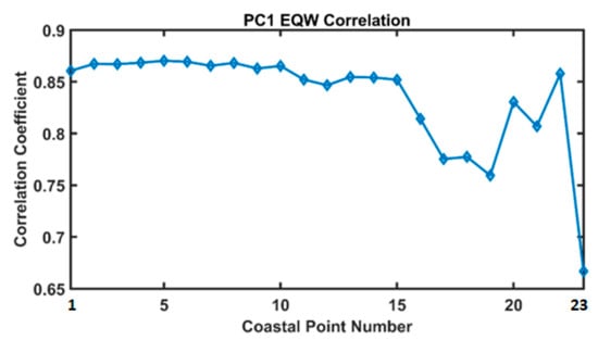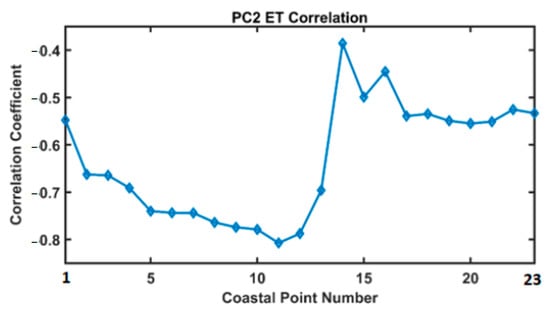 Refs. [13,44] observed that equatorial zonal wind forcing triggers two pairs of upwelling and downwelling equatorially trapped Kelvin waves along the coastal waveguide of the BoB. Hence, to ascertain the driver of this mode, the correlation coefficient between the equatorial zonal wind forcing and the SSHA at each coastal point reconstructed from the first CEOF mode was computed (Figure 11). The greatest positive correlation (>0.86) is observed between point 1 (Kashinagara, 18.790°N) and 10 (16.293°N), with the greatest value (0.87) observed at point 5 (17.950°N, north of the Tandava river). Similarly, as the second CEOF closely resembled the coastal SSHA response associated with coastal upwelling, the correlation coefficient between the local AWS and the SSHA at each coastal point reconstructed from the second CEOF mode was also computed (Figure 12). As a positive AWS results in coastal upwelling, which is associated with a negative SSHA [1,2], this correlation is expected to be negative if the second CEOF mode is indeed associated with coastal upwelling. Figure 12 illustrates the strong negative correlation (i.e., less than −0.70) between point 5 (17.590°N, north of the Tandava river) and 12 (15.889°N, north of Chinnaganjam), with the strongest correlation of −0.80 at point 11 (15.972°N). A slightly weaker negative correlation (<−0.65) was also observed at points 2–4 (18.554°N–18.026°N) and 13 (Chinnaganjam, 15.672°N).