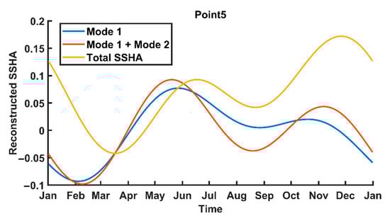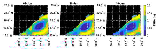 Figure 8 illustrated a large patch of positive SSHA in the southwest BoB that weakened progressively from May and ultimately dissipated within the first half of June. This might be associated with the anticyclonic gyre formed in the mid-February under the influence of the first upwelling Kelvin wave [44]. Ref. [44] also observed that this anticyclonic gyre reached maximum extent in early May and dissipated subsequently. The strong positive SSHA observed from May to June, between 15 and 22 in Figure 6, is related to this anticyclonic gyre. A patch of negative SSHA also developed in the southern BoB off the east coast of Sri Lanka (to the south of 10°N and west of 85°E) from early June. By August, it expanded northward and eastward and reached the 15°N latitude along the east coast of India. This may be related to the pair of cyclonic eddies which form off the southeast coast of India around this time [44]. The associated negative SSHA can be noticed in Figure 6, to the south of point 20, in late August and early September. The SSHA variations associated with the coastally trapped Kelvin waves and those linked to coastal upwelling, and the interaction between the two cannot be discerned clearly through simple time series or climatological analyses. As the coastal upwelling signals were obscured in the north by coastally trapped Kelvin waves and in the south by the anticyclonic gyre, a CEOF analysis was employed to isolate SSHA variations associated with each phenomenon and analyze their interaction.