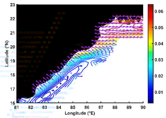 Magnitude (colored contours) and phase (purple arrows) of first mode of CEOF in the northwest BoB.