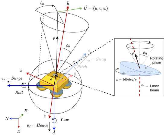 where is the function modeling the rotational motion influence on each of the 50 LoSs of the lidar conical scan. The inputs to are the IMU-measured lidar rotation attitude (roll, pitch and yaw) at each LoS and sampling time during the conical scan (50 LoS/scan, equivalently, 50 Hz sampling rate) and the initial phase, . The output is the set of estimated motion-corrupted lidar pointing directions denoted as , in the global North–East–Down (NED) frame of reference.