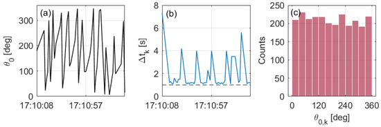 Figure 3 shows the initial-phase time series, , for the UCM model in response to the time-lag series, . The resulting initial-phase distribution is also shown. The time-lag series was generated from one hour of lidar-recorded timestamps. The initial phase at start time s was = 180 deg. In Figure 3b, it can be observed that the time lag, , usually departed from the nominal ≃1 s scan time (baseline), with noticeable lag dropouts approximately every 15 s being caused by the lidar internal CPU interruptions. The initial-phase time series shown in Figure 3a tentatively demonstrated uniform random behavior over [0, 360) degs. The uniform distribution was corroborated in the 30 deg bin histogram in Figure 3c.