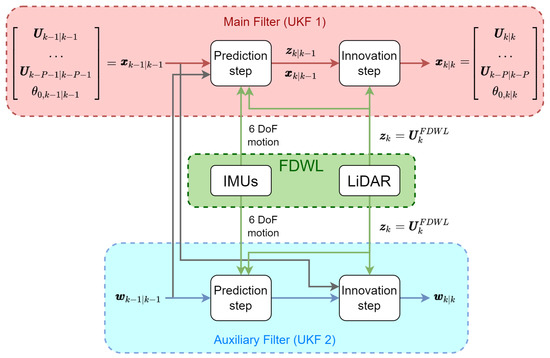 As illustrated in Figure 4, the weight vector estimated at time by UKF2, , is used by UKF1 to estimate the wind vector at the prediction step. Similarly, the wind-vector and initial-phase estimates at , denoted as and , respectively, which are part of the state-vector estimated by UKF1, are used to estimate the weight vector at the UKF2 innovation step. Both filters use the motion-corrupted wind vectors retrieved by the FDWL () at both the prediction and innovation steps, and the IMU-measured FDWL attitude (6 DoFs) at the prediction step. The formulation of the two filters is detailed in the subsections below.