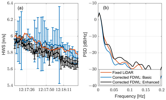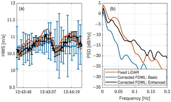 Two case examples are presented next to illustrate the comparative performance between the basic and enhanced models of Section 2.2.2 and Section 2.2.3, respectively, under two different turbulent regimes: (i) low-frequency turbulence (Figure 5) and (ii) high-frequency turbulence (Figure 6). These figures compare the 10 min motion-corrected time series and related spectra when using the basic and enhanced models with reference to the fixed lidar and the uncorrected FDWL. The error bars depicted are indicative of the uncertainty in the estimations. The uncertainty is computed as the square root of the main diagonal first element of the a posteriori error covariance matrix (Algorithm A1, step 3 in Appendix A). The main diagonal is the a posteriori state-noise error variance vector associated with the state vector (see Equation (1)), so that its first element (Equation (2)) corresponds to the error [40]. A similar approach was followed by Araújo et al. [41] to assess the Kalman filter error on the estimation of the atmospheric boundary layer height.