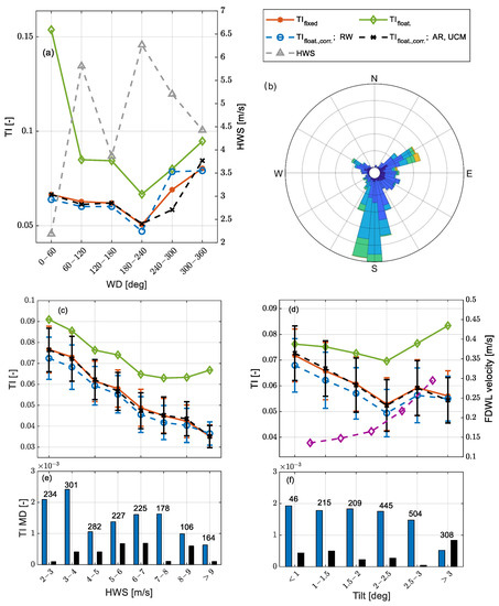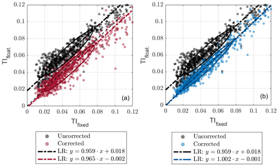 When measuring wind turbulence intensity (), FDWLs measure higher due to the wave-induced variance addition [14,17]. , defined as the ratio of the standard deviation to the mean , is one of the most relevant parameters to be measured in wind energy due to its relevance on wind turbine operation and power production [18,19]. For instance, wind turbine models need to predict power production in varying atmosphere environments [20]. Moreover, erroneous values in the site assessment phase may result in over-designed wind turbines, which would increase the wind farm project cost [21].